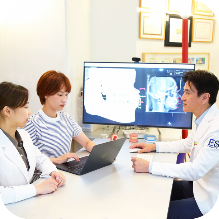 矯正治療で最も大切なのは、それぞれの患者さんに合わせた診断とゴール設定です。骨の位置や筋肉の活動も含め、成長変化や加齢変化も考慮して、顔の形、歯の大きさ、顎の大きさ、歯ぐきの状態、筋肉の働き、呼吸や姿勢などの機能、噛み合わせ、そして審美性も考慮した診断を行います。イースマイル国際矯正歯科では、インビザライン専門ではできない、装置に依存しない診断と治療を提供します。患者さんそれぞれの過去を踏まえて、最善の未来へとつなげるのが、イースマイルの矯正治療です。