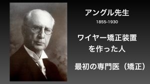 現代矯正学の父と呼ばれたEHアングル先生(1855-1930)は、今のワイヤー矯正装置の主流である「エッジワイズ装置」を発明した先生です。彼は、アメリカに歯科の世界で初めての専門医として矯正専門医を作り、矯正治療を教えるアングルスクールを開校。そのアングルスクールの卒業生が元になって、今もアングルソサエティという学会として続いています。