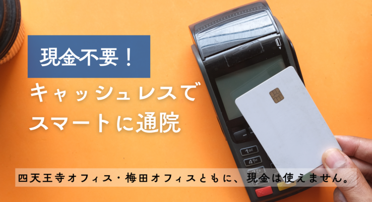 四天王寺オフィス、梅田オフィスともに、現金は使えません。 「えっ、現金がないの?」と思う方もいるかもしれません。 でも安心してください。 当院では、クレジットカード、QRコード決済、電子マネーでお支払いいただけます。